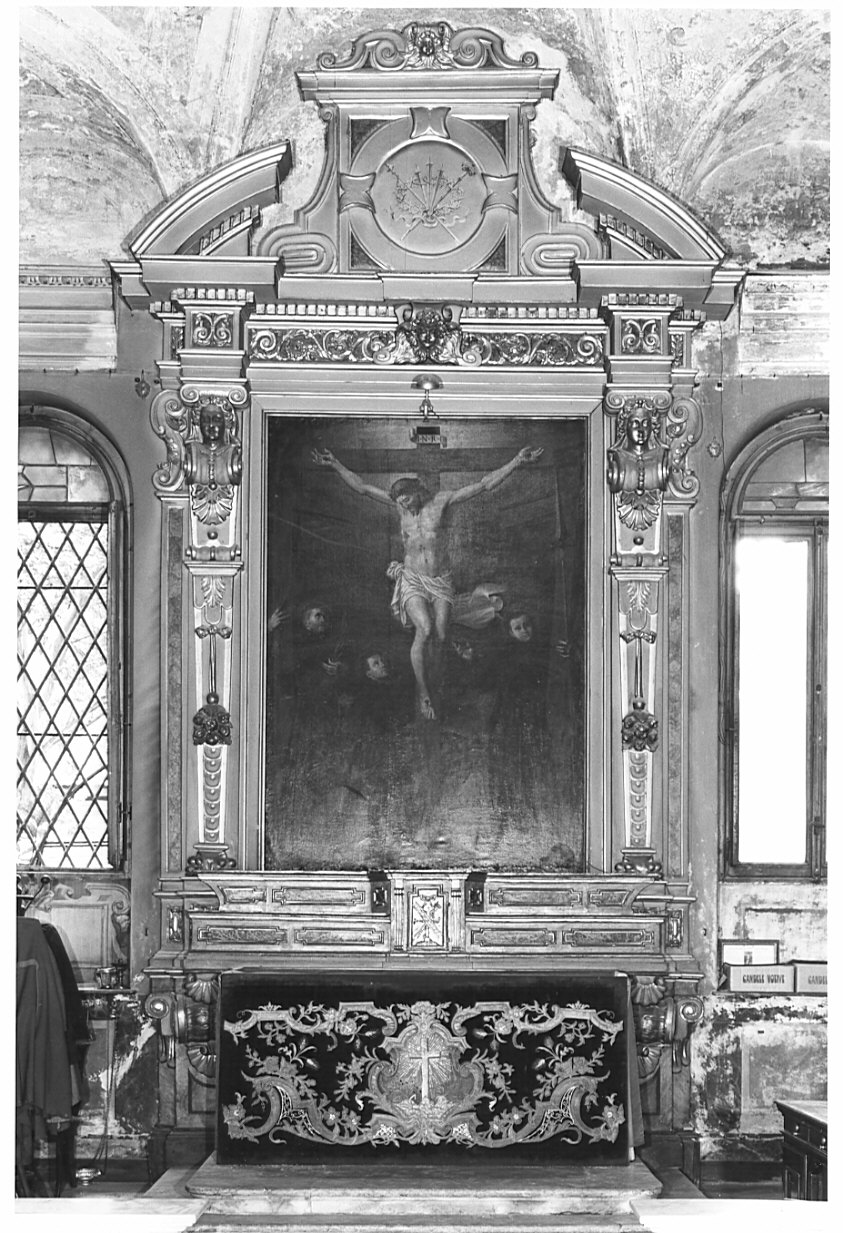 L'altare consiste in una cornice poggiante su due gradini, sormontata da un timpano curvilineo spezzato con un tondo al centro, raffigurante i simboli della passione, sovrastato da un cherubino. Ai lati due lesene con busti femminili alle sommità sorreggono un fregio con un cherubino al centro. Il fondo è avorio, i fregi dorati. Paliotto d'altare su velluto