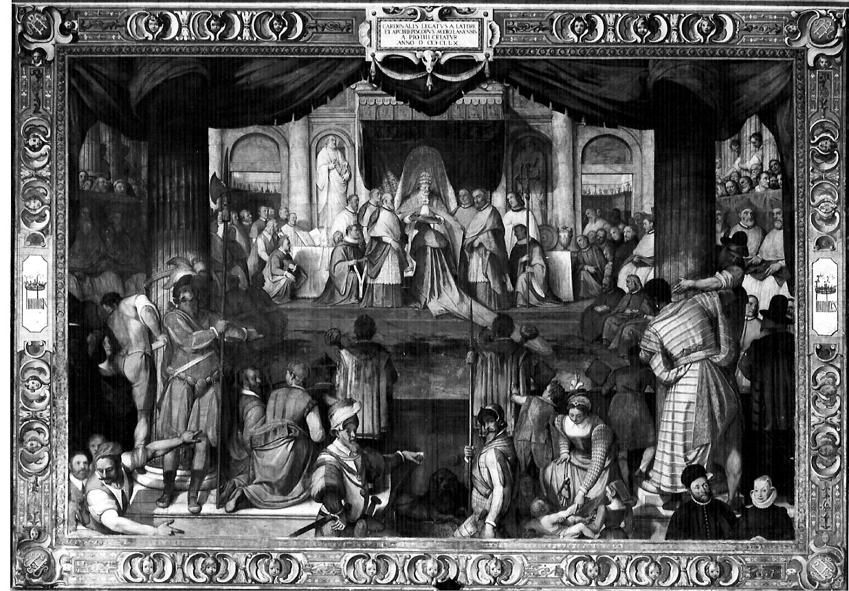 - ISCRIZIONI nel cartiglio in alto - CARDINALIS LEGATUS A LATERE/ ET ARCHIEPISCOPUS MEDIOLANENSIS/ A PIO IIII CREATUR/ ANNO DCIO CLIX - lettere capitali - a pennello - latino
