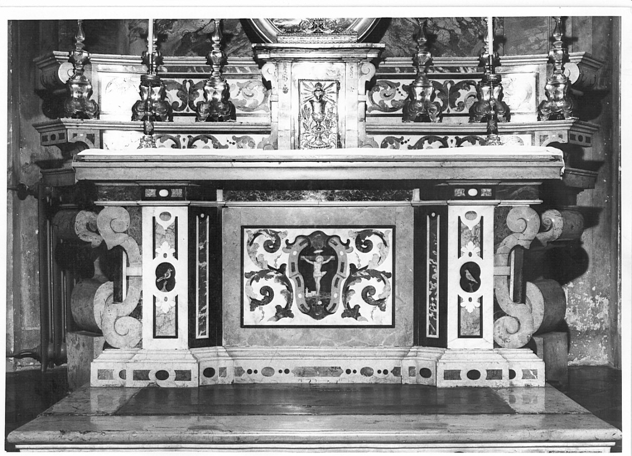 L'altare è composto di due parti: la prima più bassa formata dall'alto basamento di marmo chiaro con inserti di marmi colorati e dal paliottotra volute di marmi di vari colori reca la crocifissione; il piano dell'altare in marmo chiaro e due parti in alzato composte anche esse da marmi chiari e volute colorate e terminanti in voIute. Al centro il tabernacolo