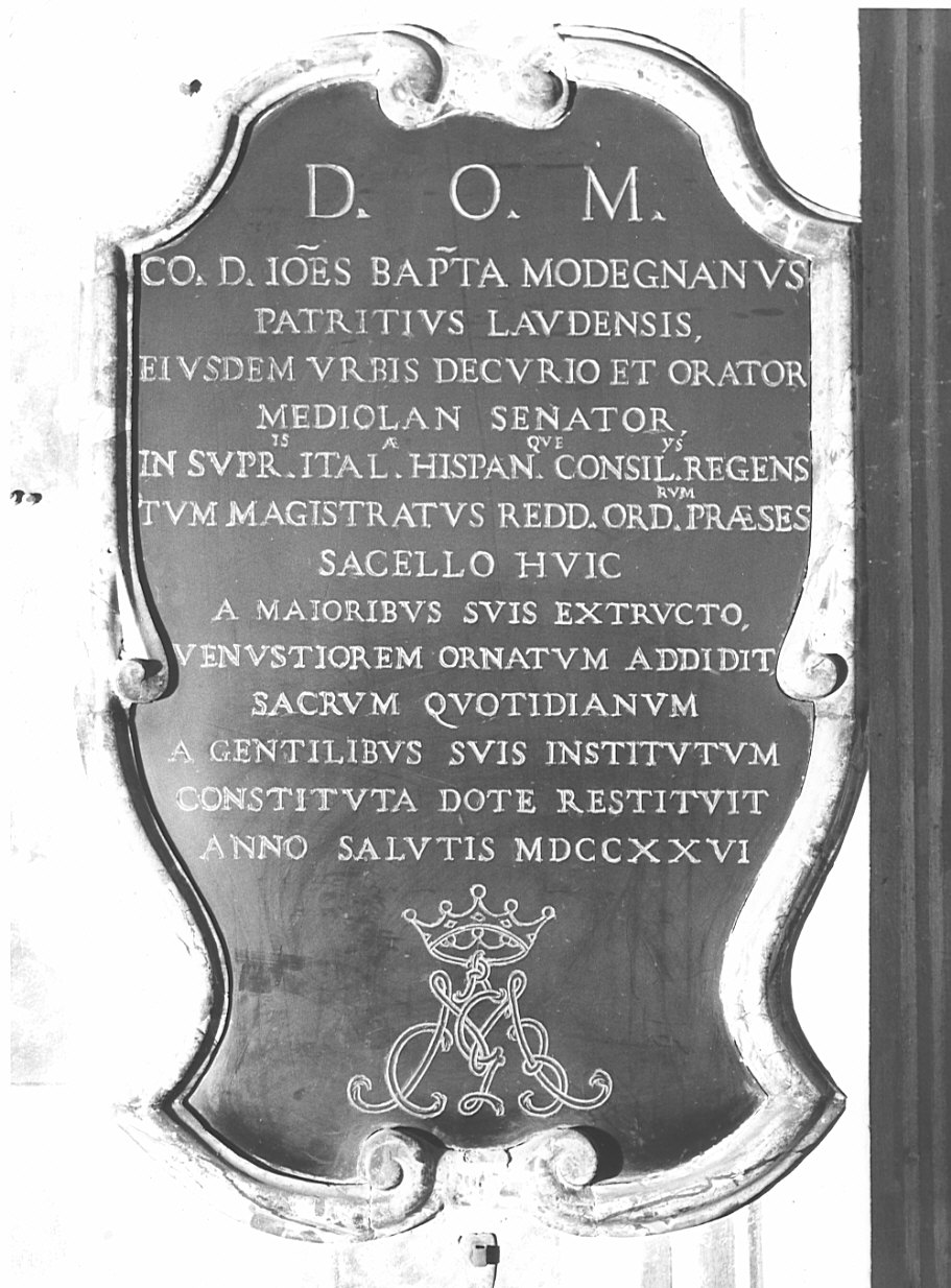- ISCRIZIONI centrale - D.O M.CO.D.IOES BAPTA MODEGNANUSPATRITIUS LAUDENSISEIUSDEM URBIS DECURIO ET ORATORMEDIOLAN SENATORIN SUPR.ITAL. HISPAN.CONSIL REGENSTUM MAGISTRATUS REDD.ORD.PRAESESSACELLO HUICA MAIORIBUS SUIS EXSTRUCTOVENUSTIOR ORNATUM ADDIDITSACRUM QUOTIDIANUMA GENTILIBUS SUIS INSTITUTUMCONSTITUTA DOTE RESTITUITANNO SALUTIS MDCCXXVI - lettere capitali - a incisione -