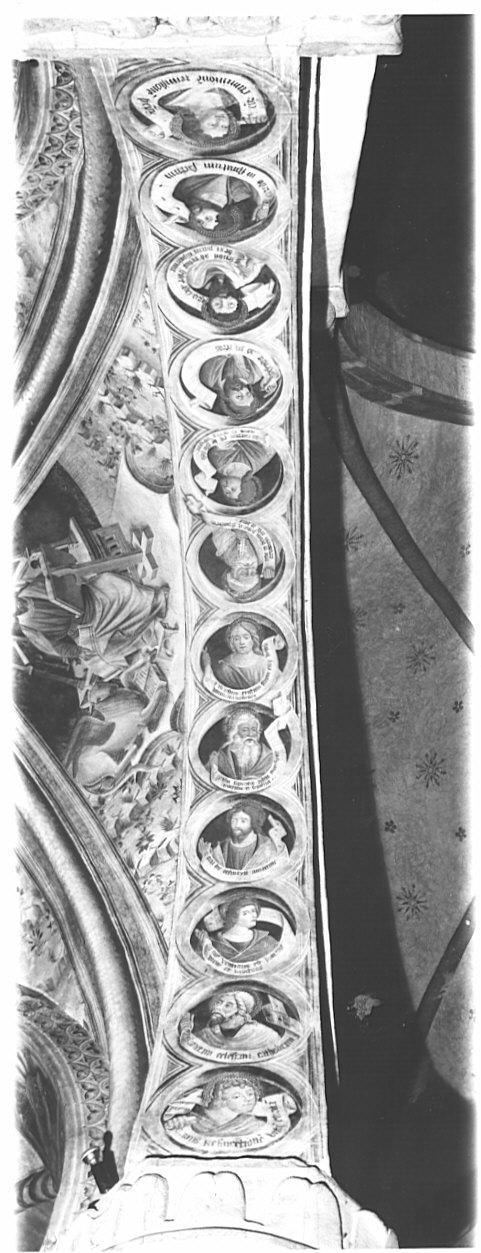 Entro tondi di finto marmo, su fondo nero 12 apostoli con in mano un cartiglio bianco su cui sono scritti versi del Credo