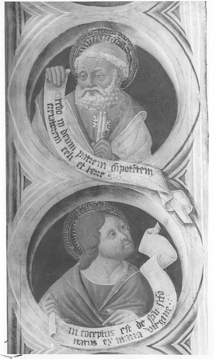 - ISCRIZIONI nei cartigli - Credo in deum patrem onnipotentem/ in conceptos est de spritu sancto - caratteri gotici - a pennello - latino