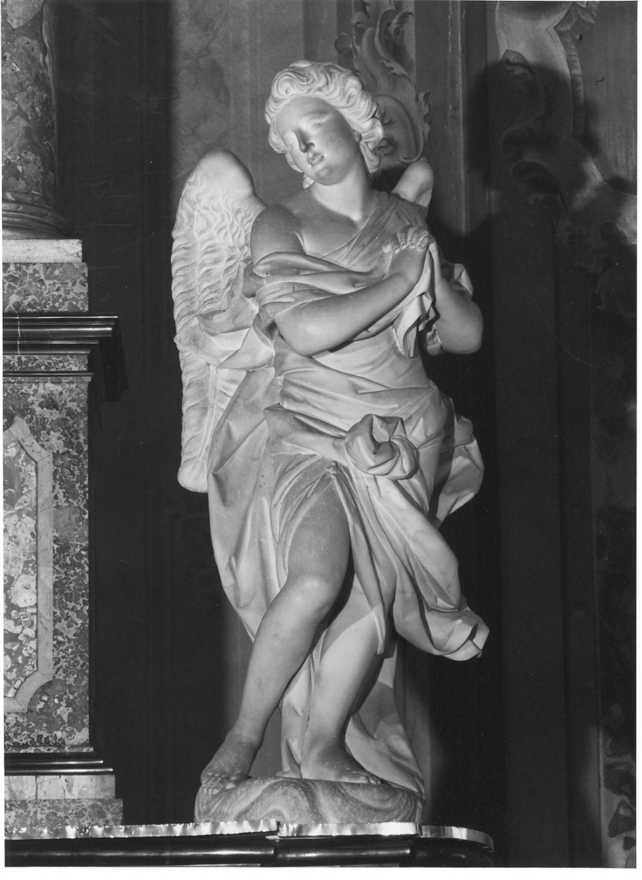 Statua d'angelo con le braccia incrociate, il capo rivolto al centro dell'altare e la gamba destra avanzata