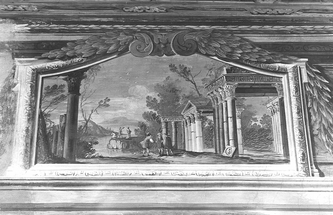 Fascia affrescata lungo tutte le pareti della stanza, sotto il soffitto