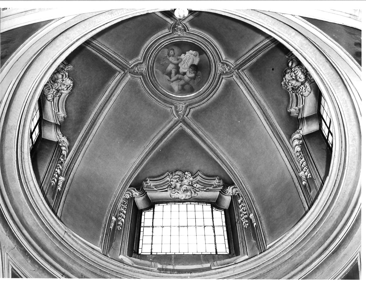 Decorazione della cupola a crociera voltata su cornice profilata circolare. Decorazioni in stucco dipinto in bianco e avorio. Attorno alle 4 finestre: mosso fastigio con coppie di cherubini e festoni laterali. Costoloni e tondo centrale profilati da cornicetta bombata. Nei punti d'incontro, 4 ovali fra volute