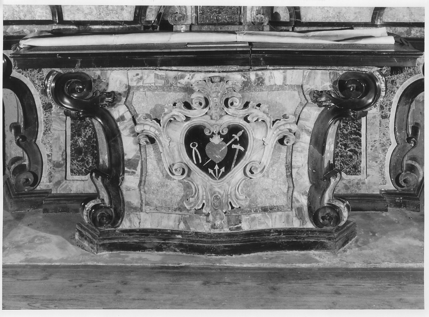 Paliotto con al centro una cartella in marmo grigio e giallo in cui sono intarsiati, su fondo nero, i simboli della Passione