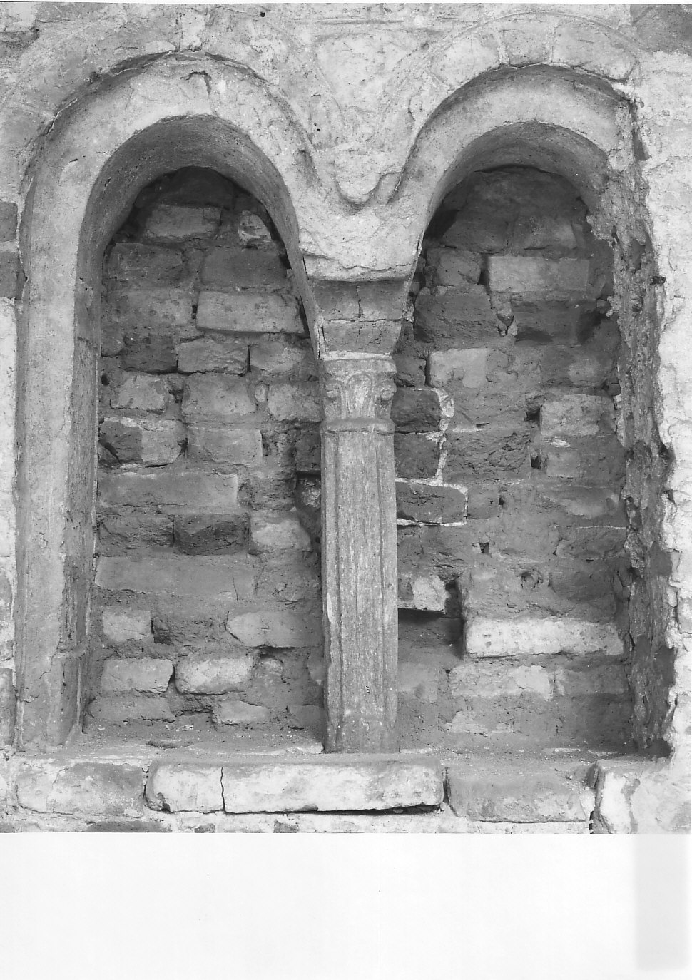 - NOTIZIE STORICO CRITICHE Il manufatto scultoreo è affine a quello della vicina bifora dello stesso chiostrino. Pur se affine all'altro pilastrino per materiale e tecnica di lavorazione, si notano delle differenze. Si tratta di elementi scultorei di evidente uso secondario (il pilastrino e il capitello superiore presentano la faccia posteriore non lavorata, facendo presupporre una collocazione originariamente addossata ad una parete), reimpiegati nel chiostrino romanico. Il CHIOLINI, Chiarimenti sulla struttura medievale della chiesa di S.Pietro in Verzolo di Pavia, in "Atti del 4° congresso interv. di studi sull'Alto Medioevo", Spoleto, 1969. Lo stesso autore propone per questi elementi scultorei una datazione agli inizi dell'XI secolo. La bifora è stata ritrovata in occasione dei saggi effettuati sulla parete orientale del chiostrino nel 1968