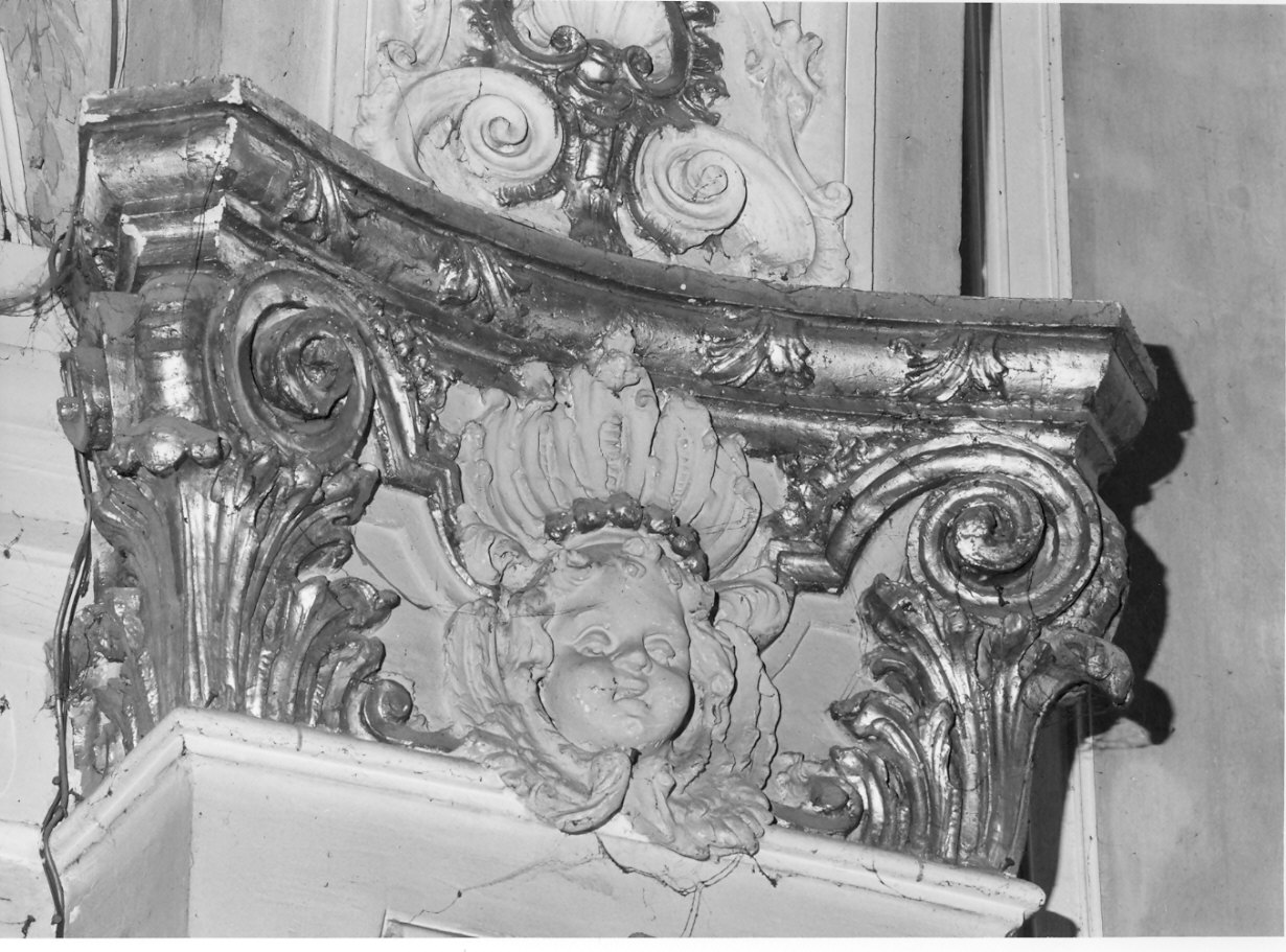 I capitelli ornano le lesene ai lati della navata centrale; agli spigoli hanno foglie d'acanto evoIute conoche dorate, al centro una testa di angioletto in stucco bianco, superiormente c'è una valva di conchiglia stilizzata, bianca con contorni dorati