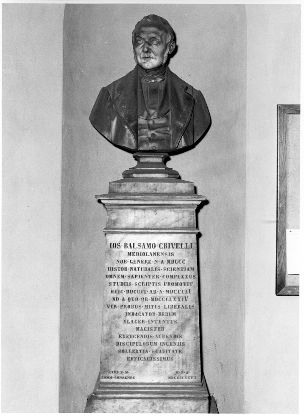 - ISCRIZIONI sul basamento - IOS. BALSAMO CRIVELLI/ MEDIOLANENSIS/ NOB. GENERE N. A. MDCCC/ HISTOR. NATURALIS SCIENTIAM/ OMNEM SAPIENTER COMPLEXUS/ STUDIIS SCRIPTIS PROMOVIT/ HEIC DOCUIT AB A. MDCCCLI/ AD A. QUO OB MDCCCLXXIV/ VIR PROBUS MITIS LIBERALIS/ INDAGATOR RERUM/ ALACER INTENTUS/ MAGISTER/ EXERCENDIS ACUENDIS/ DISCIPULORUM INGENIIS/ SOLLERTIA SUAVITATE/ EFFICACISSIMUS CIVI B. M./ COMM. CONSENSU/ M. P. A./ MDCCCLXXVII - lettere capitali - a intaglio -