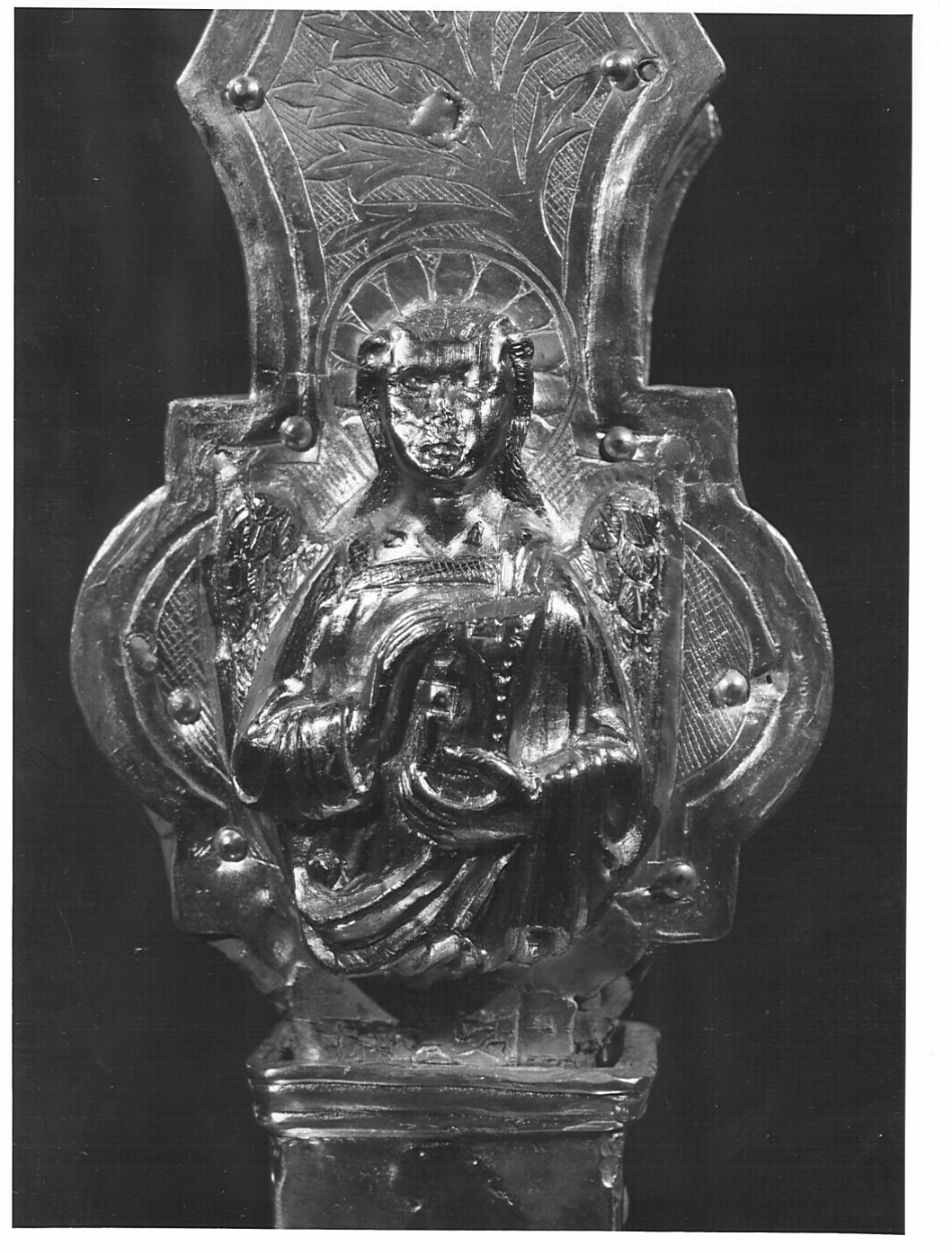 - NOTIZIE STORICO CRITICHE Lo stile è ancora gotico come composizione e concezione, ma le figure sono di stile un poco più classicheggiante. L'impugnatura è molto posteriore (secc. XVI/ XVII) e malamente adattata alla croce; la parte centrale della lastrasembra rifatta in epoca molto recente. Nelle sue parti più importanti attribuibile al sec. XV