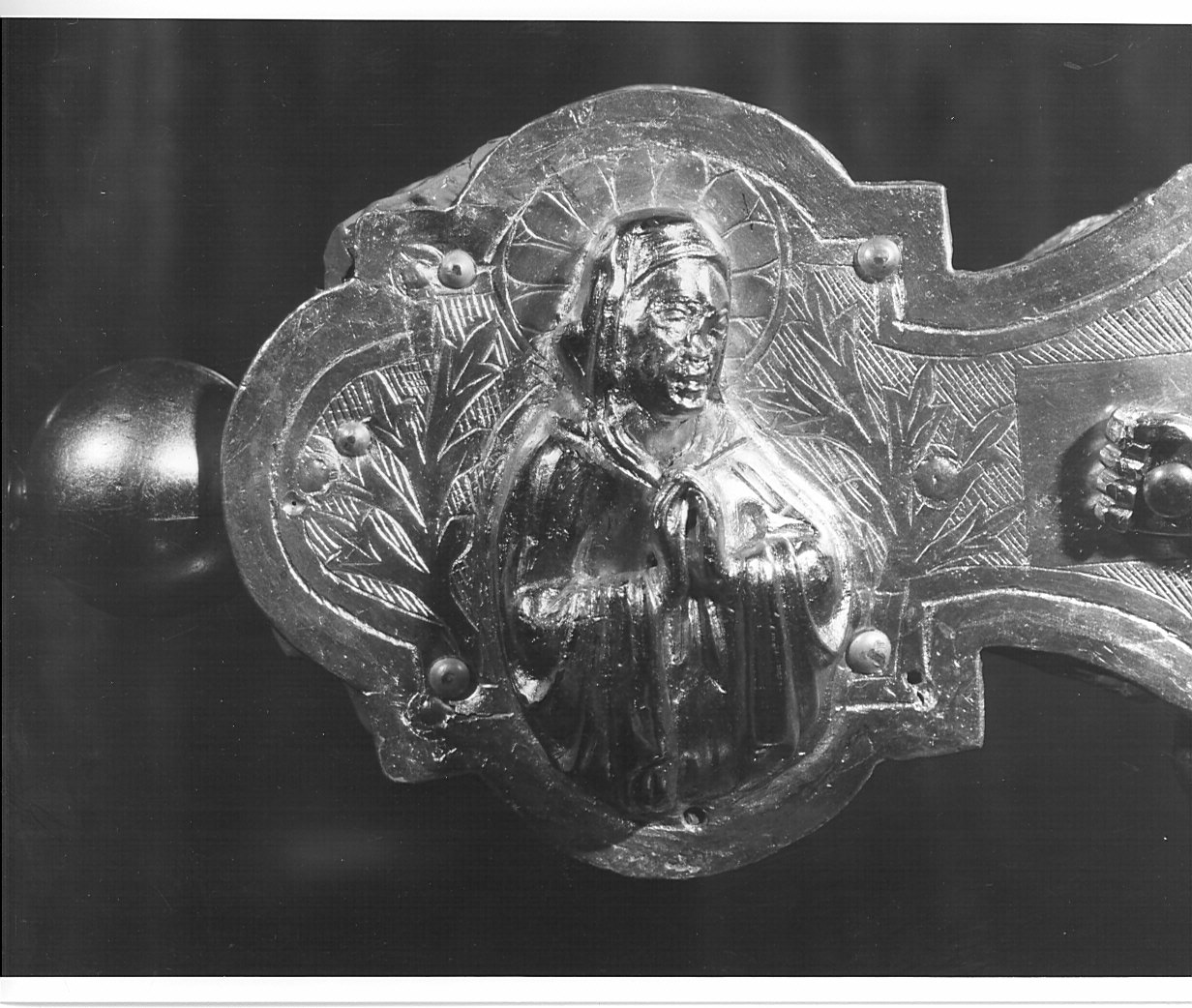All'estremità del braccio destro della Croce, sulla parte anteriore. Sbalzata a cesello, a mezzo busto, mani giunte, aureola palmata; fondo inciso con due rami a foglie e campitura a tratteggio. Figura dorata, fondo argentato