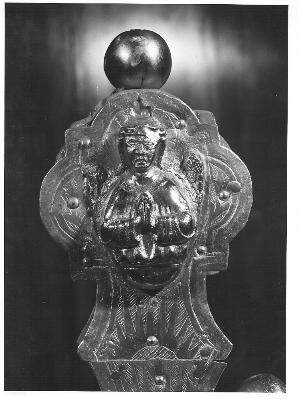- NOTIZIE STORICO CRITICHE Lo stile è ancora gotico come composizione e concezione, ma le figure sono di stile un poco più classicheggiante. L'impugnatura è molto posteriore (secc. XVI/ XVII) e malamente adattata alla croce; la parte centrale della lastrasembra rifatta in epoca molto recente. Nelle sue parti più importanti attribuibile al sec. XV