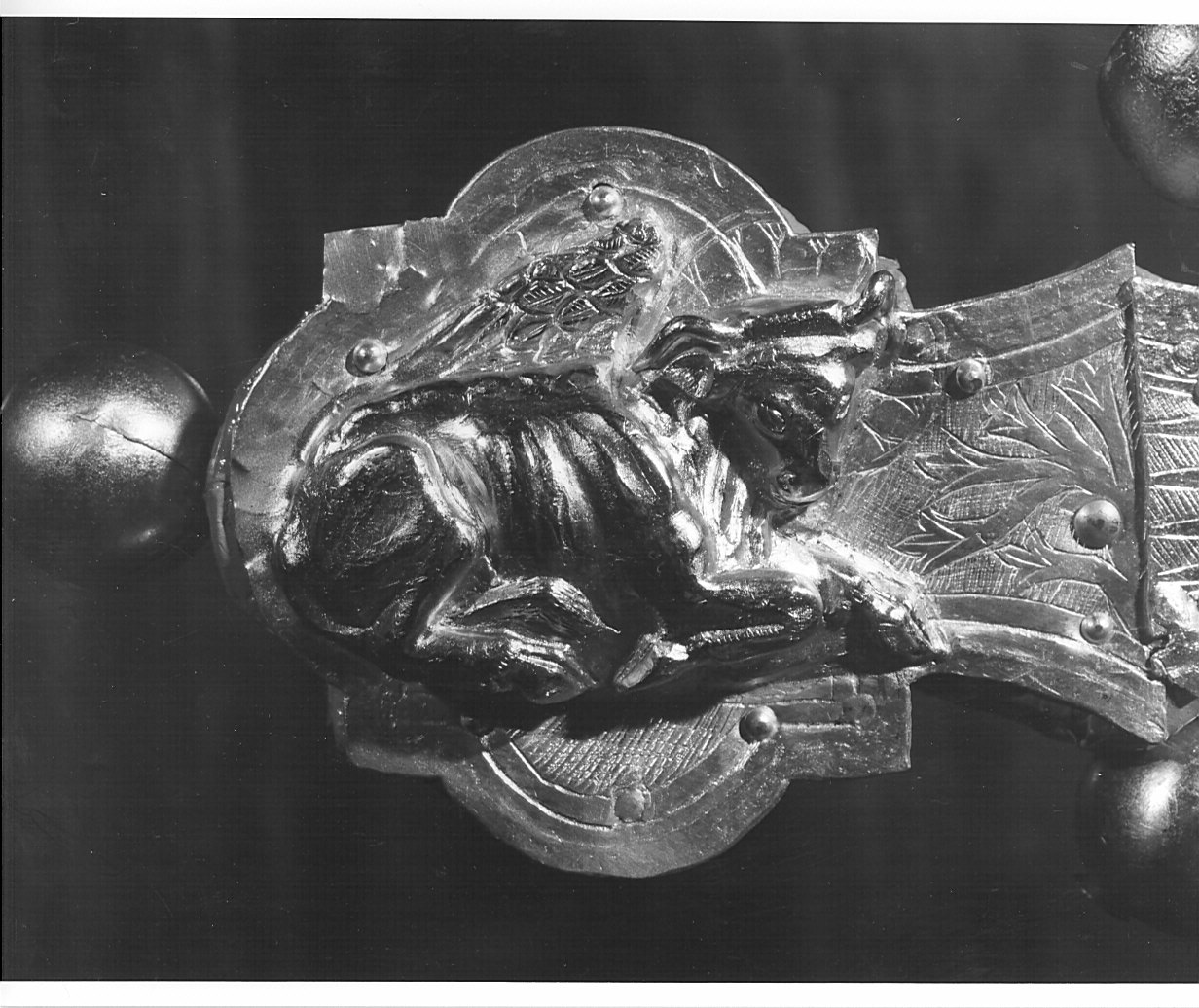 - NOTIZIE STORICO CRITICHE Lo stile è ancora gotico come composizione e concezione, ma le figure sono di stile un poco più classicheggiante. L'impugnatura è molto posteriore (secc. XVI/ XVII) e malamente adattata alla croce; la parte centrale della lastrasembra rifatta in epoca molto recente. Nelle sue parti più importanti attribuibile al sec. XV