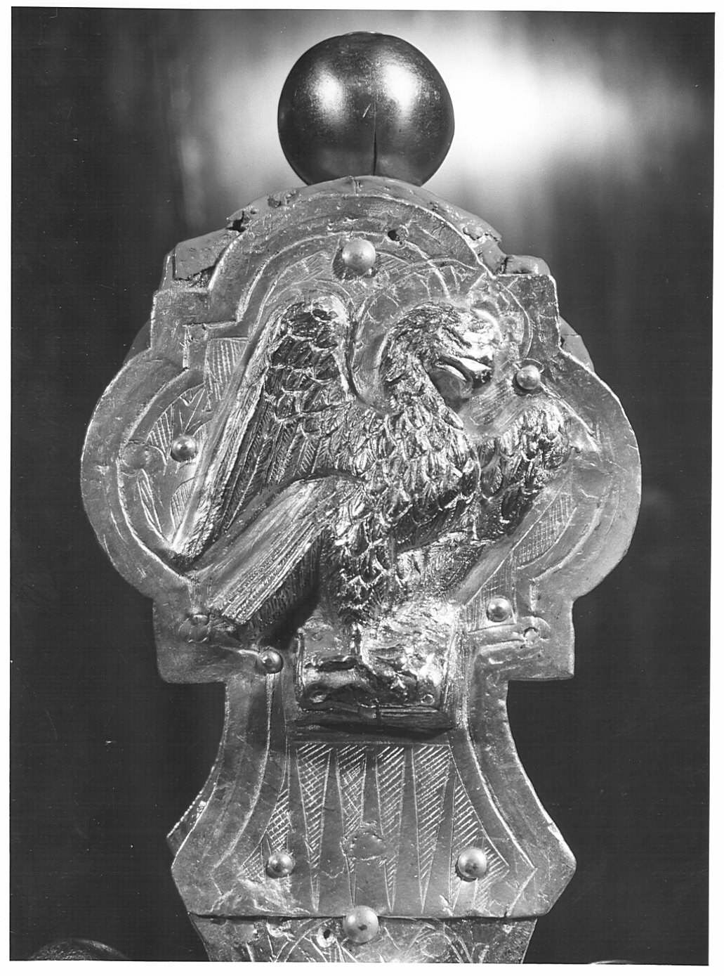 Rilievo sulla parte posteriore della Croce, all'estremità del braccio superiore. Raffigurazione con l'aquila, con un artiglio rampante; ha un'aureola palmata.Sbalzato a cesello. Figura dorata, fondo argentato