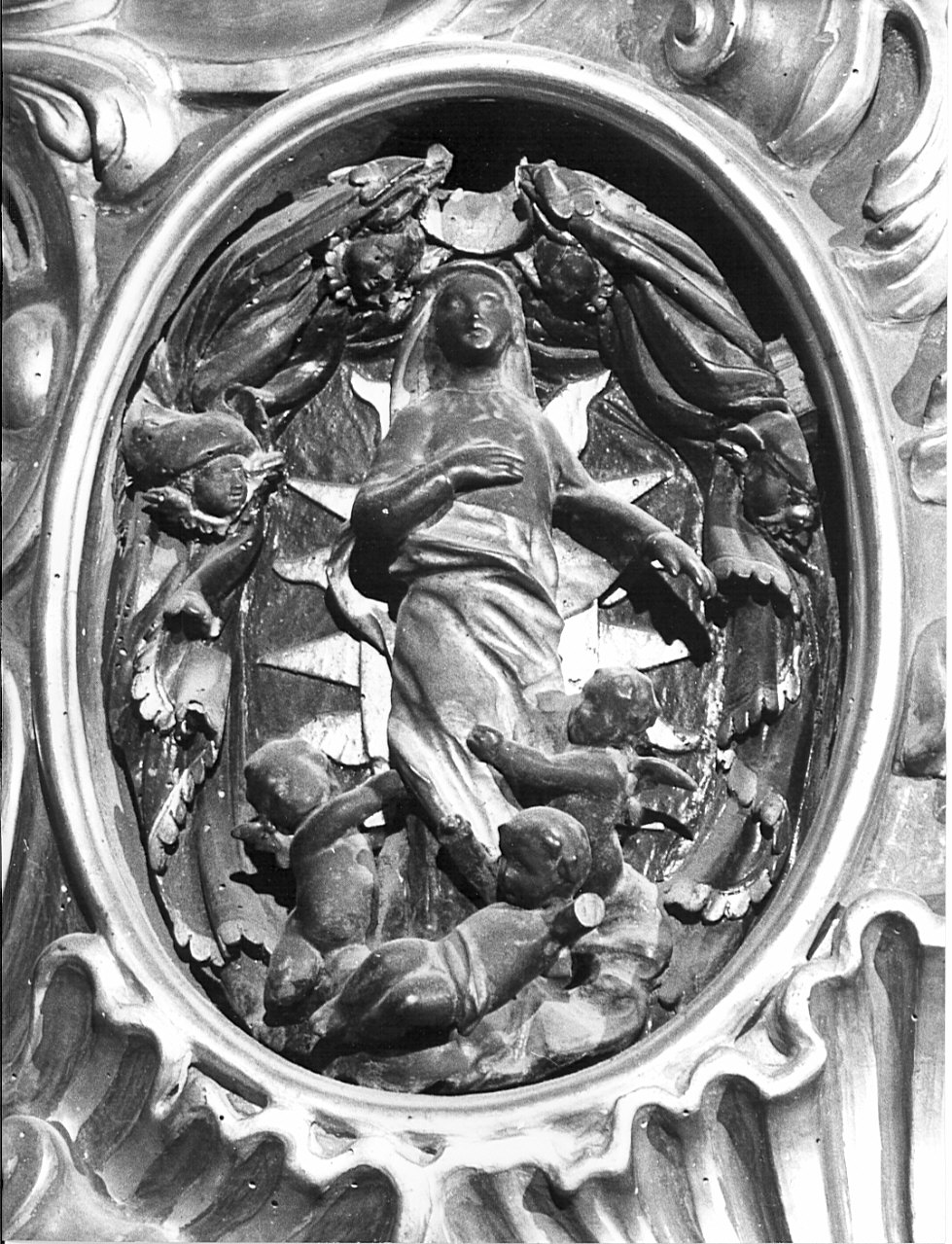 Quinto dei sette medaglioni ad alto rilievo, di cui 6: 27x20; 1: 17x25. Tali medaglioni raffigurano: Natività di Maria, Presentazione al Tempio, Annunciazione, Assunzione, Incoronazione, Visitazione, San Giuseppe e l'angelo (?). Sono incorniciati entro intagli a volute e fogliami