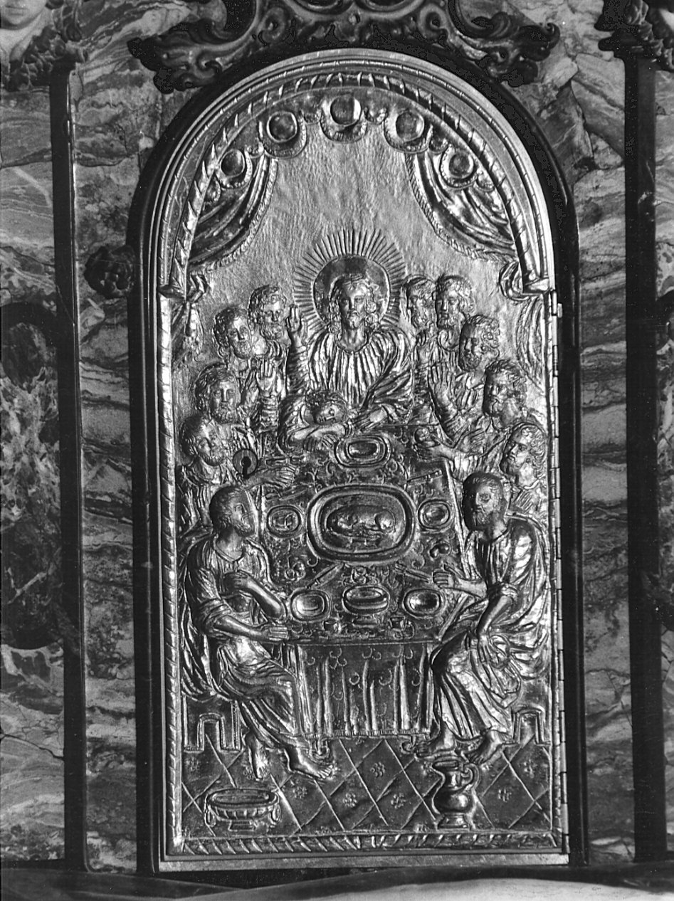 La scena dell'Ultima Cena è raffigurata entro un vano delimitato dal drappeggio trattenuto dalla cortina