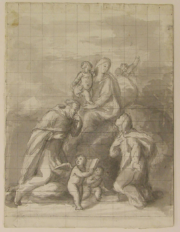 - NOTIZIE STORICO CRITICHE Si tratta certamente del primo "pensiero" per la pala della Madonna del Rosario e Santi, dipinta da Angelo Ligari per la parrocchiale di Piateda nel 1859. La scena è rappresentata in tono quasi settecentesco, la composizione è vivace, mossa, gli atteggiamenti quasi enfatici. Le figure ripetono palesemente i modelli di Pietro Ligari nelle due pale della Madonna del Rosario di Chiavenna e di Sondrio (1738). Il "pensiero" fu poi modificato con stile più composto e statico, come dimostrano il progetto definitivo edil bozzetto (N.I.L. 621 e 733), nonchè la pala stessa