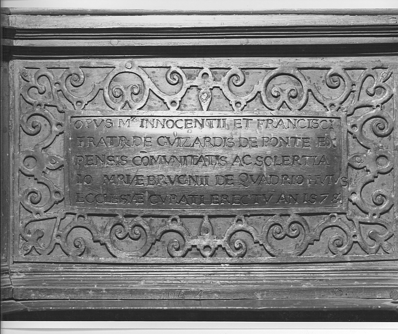 - NOTIZIE STORICO CRITICHE Fino al 1902 si ritenne prevalentemente che i fratelli Guicciardi fossero i committenti dell'opera, ma per primo il Monti, che nel 1892 aveva ripreso la stessa affermazione, assegnò ai fratelli di Ponte la paternità dell'opera. Il dubbio era sorto per il fatto che dei fratelli Guicciardi, no ci sono altre opere note. Ma probabilmente essi riservarono un'opera al loro paese natio. Nella scritta è detto che si tratta di un'opera dei "magistri" Guicciardi, realizzata a spese della comunità di Ponte e per interessamento del curato Giovan Maria Bruni Quadrio. Nell'Inventario del 1785 è citato un atto di Girolamo Guicciardi di Ponte del 14-10- 1580, foglio 102, dal quale risulta che le due scuole o confraternite del Santissimo (minore e maggiore), insieme con la comunità di Ponte, pagarono l'opera "sexcentum nonaginta aureos auri".(Cfr. Monti S., Ninguarda. La Valtellina degli atti della visita pastorale diocesana di F. Feliciano Ninguarda, Como 1892, riedizione Sondrio 1963, p. 95; Reminiscenze ed esortazioni del Sac. Gusmeroli Carlo, Prevosto e V.F. di Ponte in Valtellina al suo diletto popolo, Sondrio 1914, p. 59; Guicciardi L., In occasione che l'Ill.mo e Rev.mo Monsignor Giambattista Castelnuovo vescovo di Como, visitando la prima volta la prov. di Sondrio, amministrò la Cresima e consacrò il nuovo altare magg. nella Chiesa, Como 1824)