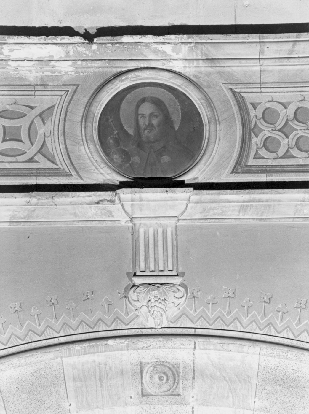 I tondi sono dipinti sopra ogni arco delimitante la navata centrale, in una cornice dipinta, esattamente al centro del semicerchio. Da sinistra sono raffigurati santa con palma, S. Rocco, S. Lorenzo; a destra, procedendo verso la facciata, San Giuseppe con il bambino, S. Gregorio Magno, San Bernardino, santa con corona (S. Cristina ?). I colori sono abbstanza vivaci e la fattura discreta
