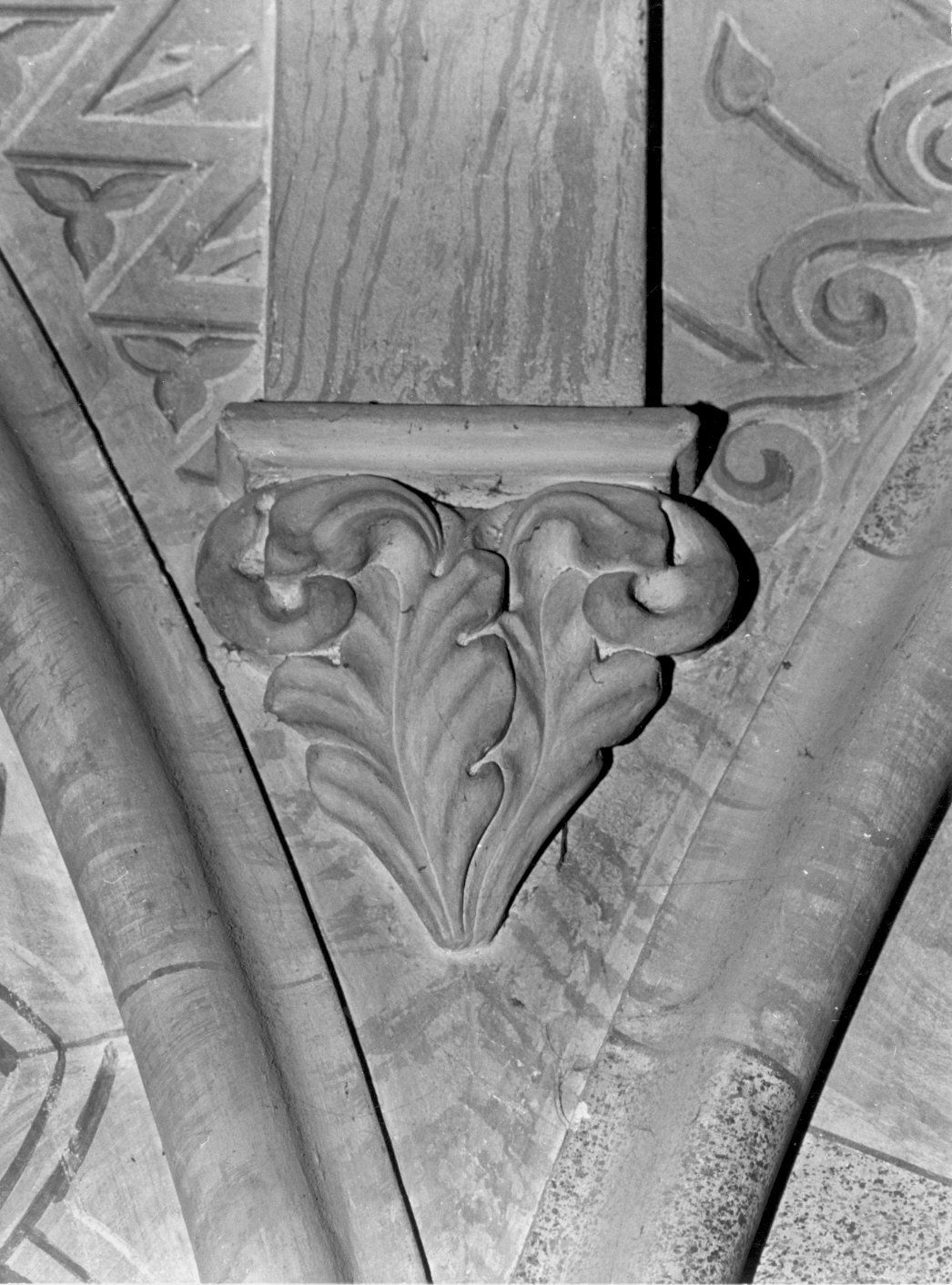 Peduccio della serie di sette. Si tratta dei peducci dove terminano le lesene che scendono in corrispondenza delle colonne, fermandosi all'incrocio delle volte. Due sono sulla controfacciata con motivo a foglia. Anche gli altri peducci, tutti a forma triangolare, mostrano motivi fogliacei vari, alcuni simili ai capitelli delle colonne sottostanti