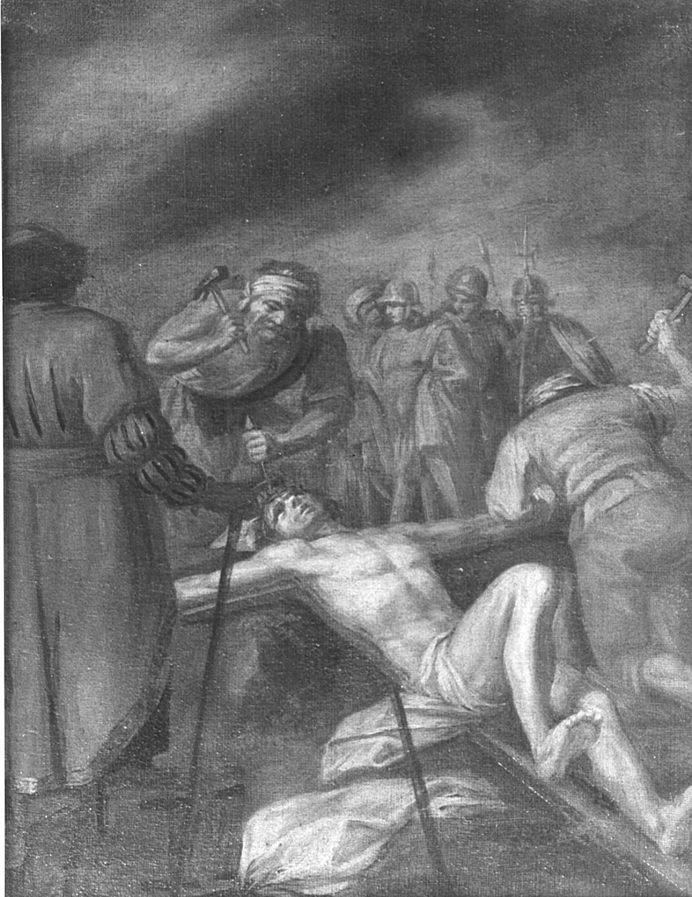 - NOTIZIE STORICO CRITICHE Il dipinto fa parte della serie delle 14 stazioni della Via Crucis appese alle pareti della navata. Le tele provengono quasi con certezza dalla vecchia chiesa parrocchiale e potrebbero essere state adattate (anche con qualche taglio laterale) alle attuali cornici. Mancano notizie sull'autore, probabilmente bergamasco. La datazione (sec. XIX) proposta dall'inventario Bernareggi (1936) sembra pertinente anche se l'autore si ispira spesso a modelli settecenteschi