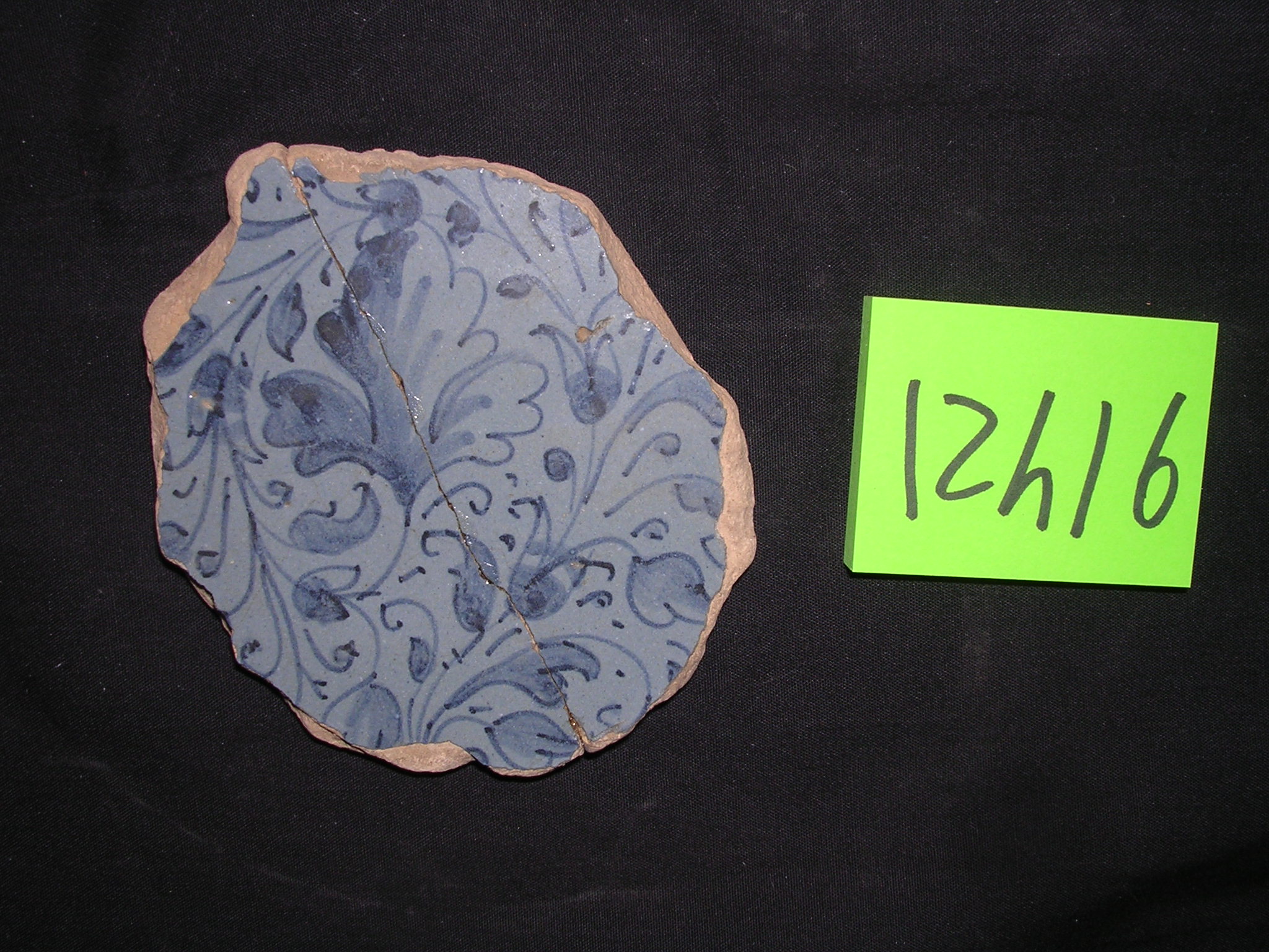 Fondo di piatto, composto di due frammenti, con ornato floreale. Su smalto berettino chiaro, racemi con campanule, foglioline e foglia di prezzemolo, dipinte di blu. Piede con sottile cercine