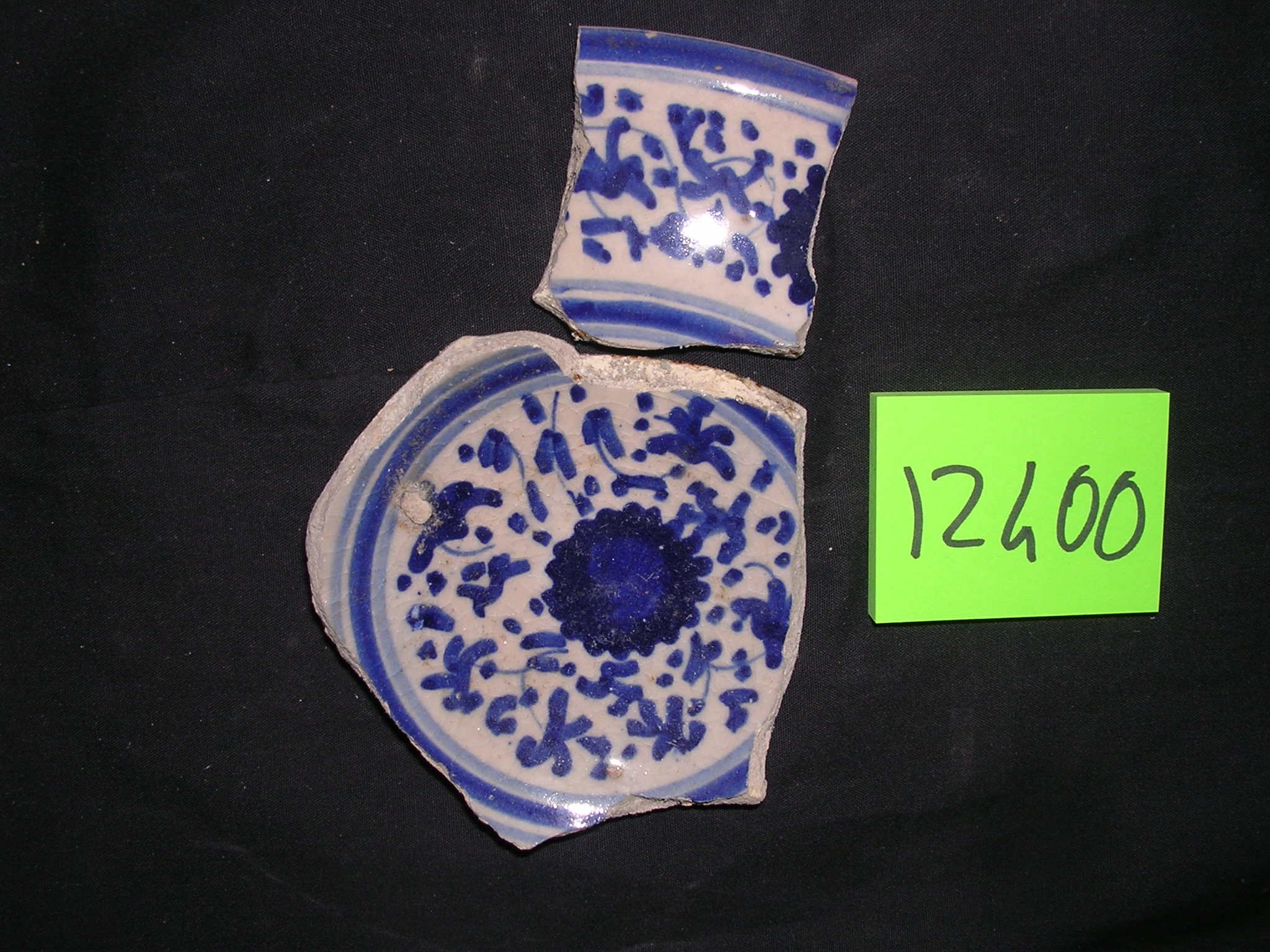 Cavo di scodella emiferica. Su fondo latteo compare un tipo di ornato "alla porcellana" con tralcio fogliato e al centro crisantemo. Colore blu. Sul rovescio pennellate in azzurro. Piede con cercine accennato. Argilla biancastra
