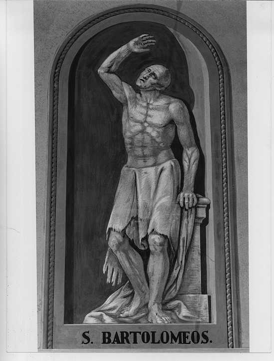 L'apostolo è raffigurato stante e con la mano sinistra si appoggia ad un pilastro, mentre il braccio destro e il volto sono rivolti al cielo. I fianchi sono coperti dalla pelle che è stata strappata al Santo durante il martirio