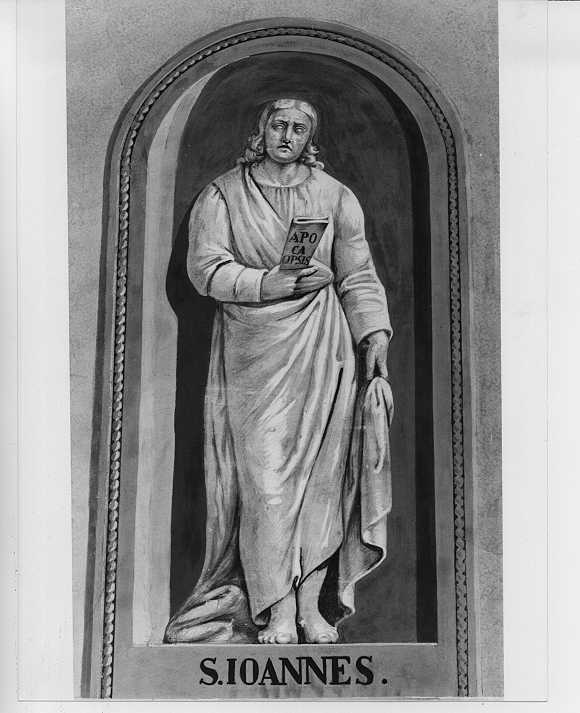 L'apostolo è raffigurato stante entro finta nicchia, con il volto incorniciato dai lunghi capelli. La mano destra regge il libro dell'Apocalisse, mentre la sinistra trattiene il mantello che copre la lunga tunica