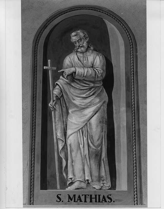 L'apostolo è raffigurato entro finta nicchia, con il volto incorniciato dai lunghi capelli. La mano sinistra indica la croce tenuta dalla mano destra. Una lunga tunica con mantello avvolge il corpo del santo