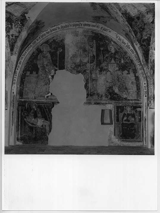 - ISCRIZIONI intorno all'affresco - MCCCCLVI DIE P. OCTOB. HOC OPUS FECIT FIERI IN REMEDIUM ANIME/ SUE ET UXORIS EIUS STRENUUS VIR ALIXANDRINI DE PILIGRINIS DE/ MATINEGO CIVIS BRX ET PATER VE NERABI LI DNI DOM. JOH. IS ORDIS/ CLUNIACEN POR HUI MONASTERII LAUS DEO - caratteri gotici -