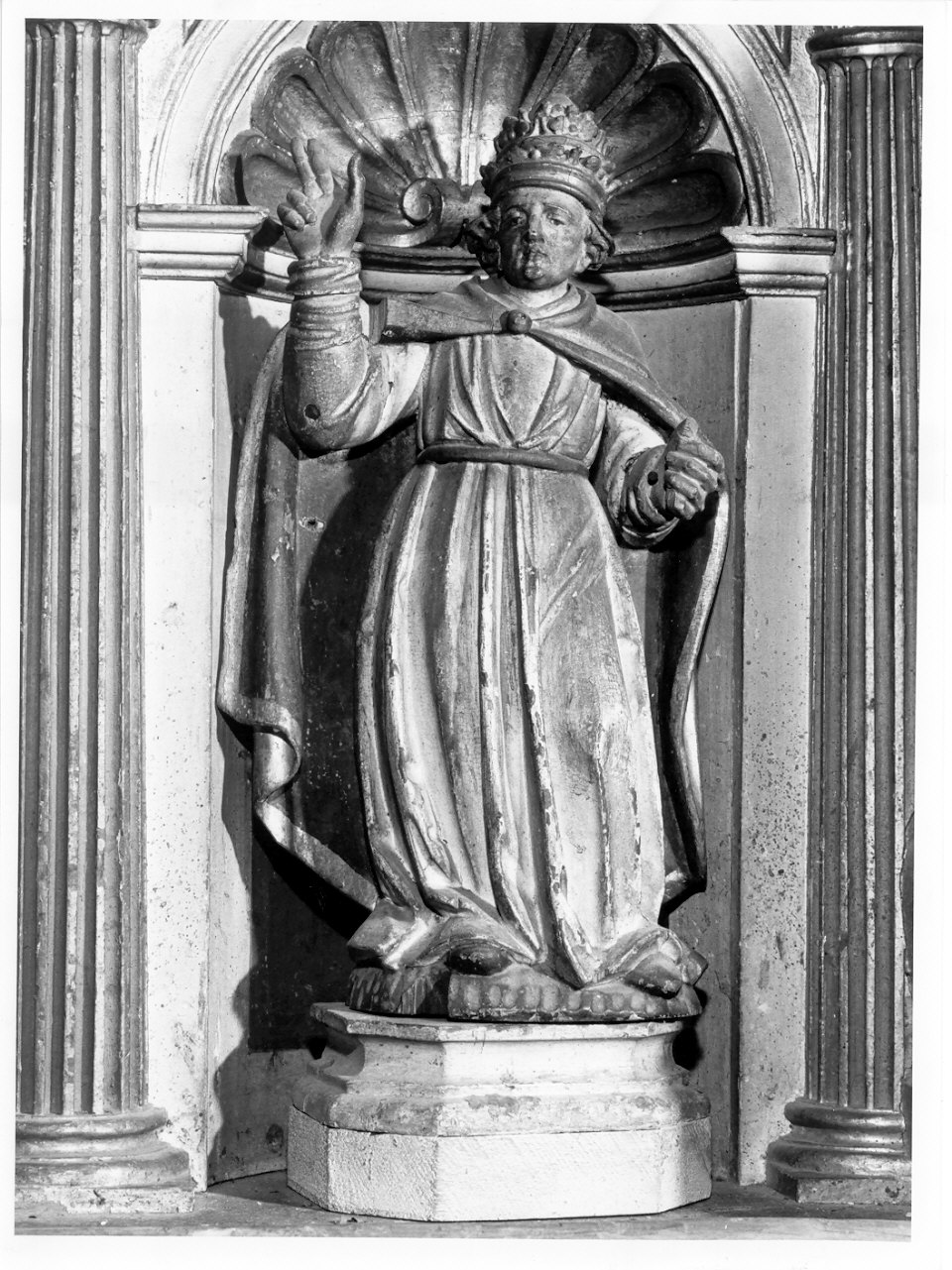 - NOTIZIE STORICO CRITICHE "Si tratta ad evidenza del medesimo intagliatore che eseguì per il vicino altare di Sant'Antonio Abate la statua del santo titolare ...Si può notare come nei due santi abati siano pressochè identici la posa, il modellato dei panneggi e della mano, e come uguale sia la tipologia dei visi... : la barba ondulata simmetricamente spartita, il naso dritto, il taglio degli occhi dagli angoli cadenti, il ciuffo di capelli sulla fronte, la placida assenza di espressività" (Coppa 1985, p. 155-156).La dipintura è opera di G.B. Costa