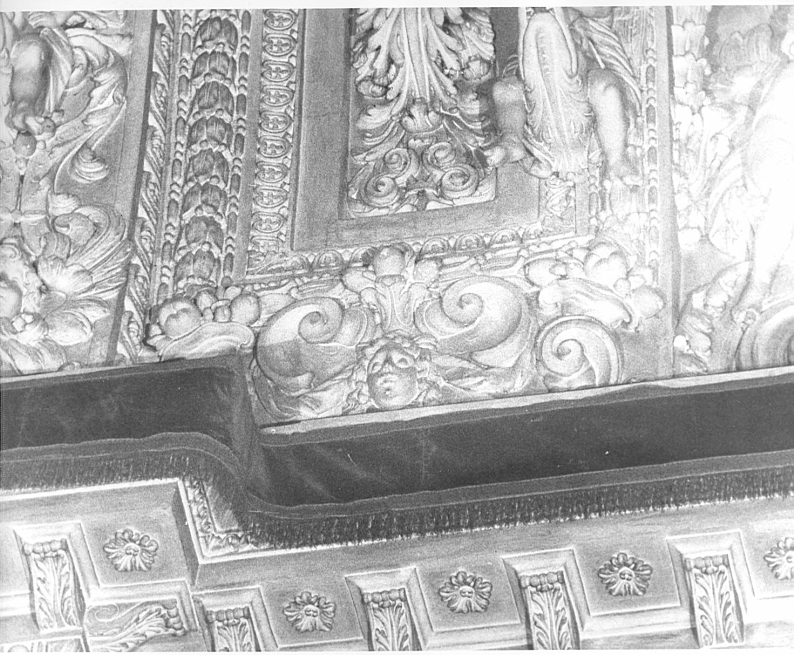 Riquadro rettangolare, avente al centro una testa femminile (di sfinge) sopra la quale si avvolgono due grandi volute. In alto al centro e ai lati, motivi di frutta e foglie. Quattro elementi identici per stampo, posti alla base degli archi trasversali della chiesa, all'inizio e alla fine