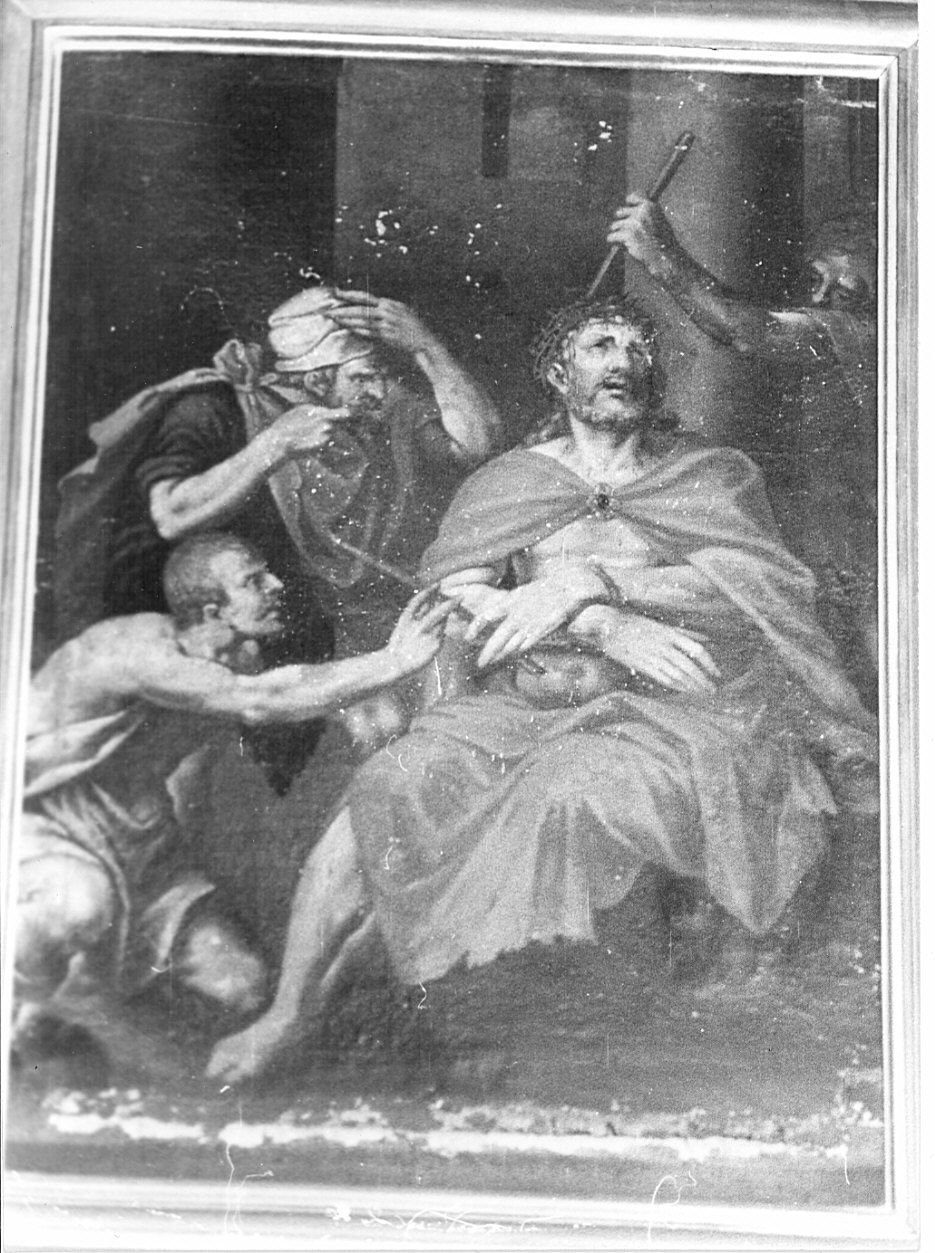 Cristo seduto sulla destra, tutto avvolto in un manto rosso vivo. Dietro a di lui, a destra, é un uomo che lo colpisce con un bastone. Davanti, un uomo semiinginocchiato, in bianco sporco, e un uomo in piedi, in verde e cou turbante bianco, lo scherniscono. Fondo molto scuro