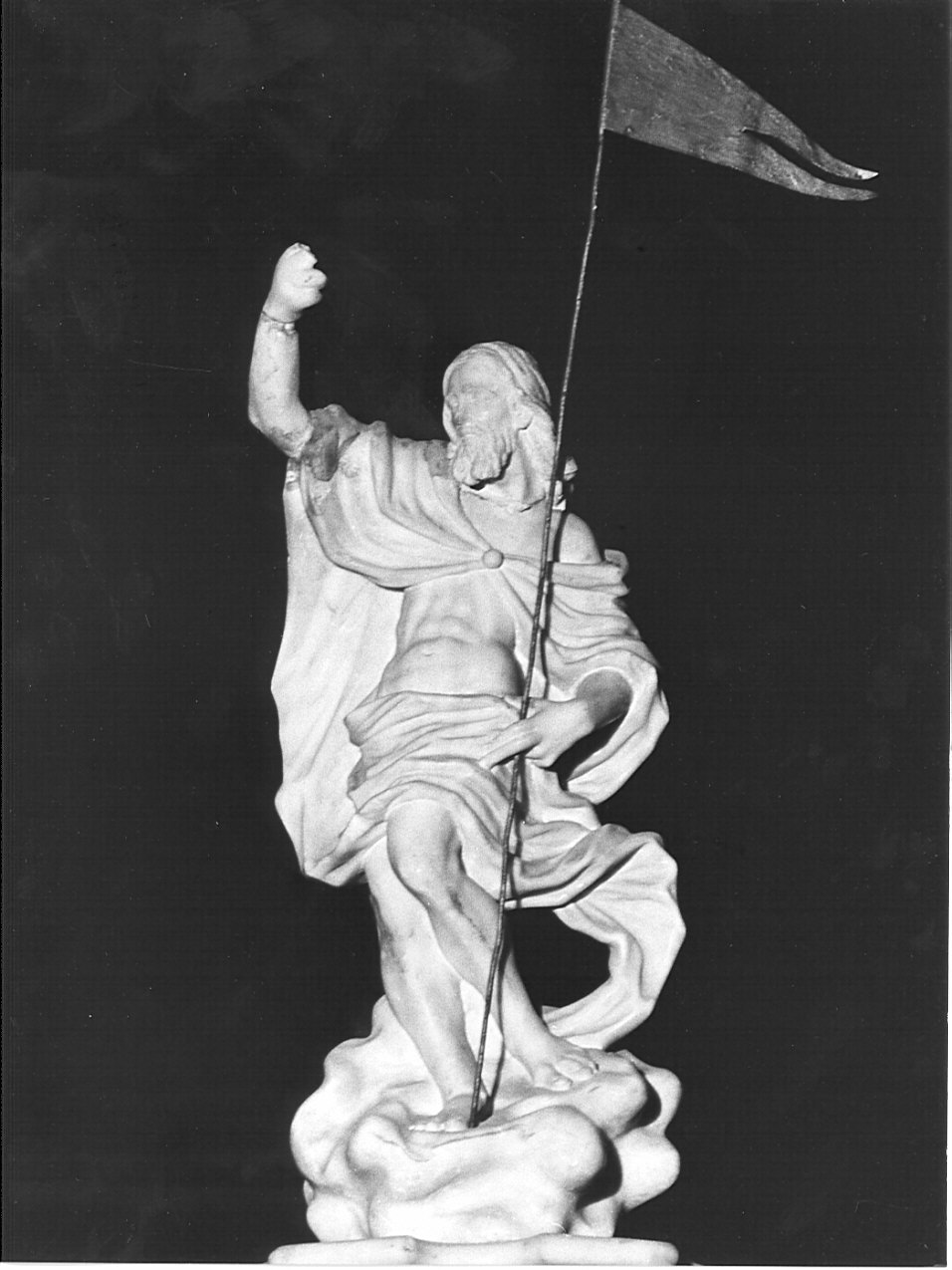 La statua presenta Cristo risorto, stante su una nuvola, con un vessillo nella mano sinistra