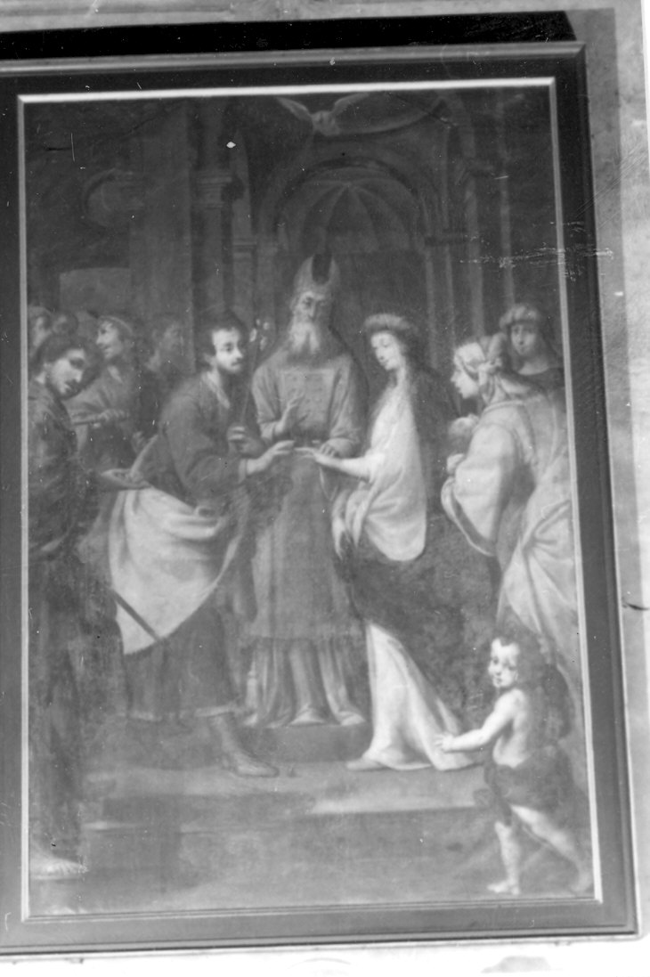 - NOTIZIE STORICO CRITICHE La documentazione reperita nell'archivio del Collegio (Acta Collegii, t. II), indica nel giorno 2 ottobre 1649 la messa in opera dell'ancona di marmo nella nuova cappella di S. Giuseppe e "il suo quadro fatto a oglio dal sig. Rizardo de'Tavolini, pittore nel sud.o Milano, che contiene il Misterio, overo Historia del Sposalizio segreto tra il d.o S. Giuseppe e la Serenissima Vergine Maria". Le fonti più tarde attribuiscono invece il dipinto al Barocci: così il CAMPINI (1770, p. 116) e il FRISI (I, 1794, p. 208), che lo ricorda appeso a una parete laterale della cappella, dopo che nell'ancona era stato sostituito dalla statua dell'Addolorata (cfr. scheda 00089085). Lo spostamento era avvenuto nel 1753, in occasione del rinnovamento della cappella, che cambiò allora dedicazione (A,S.M., Fondo Religione, p.a., cart. 2589). Nel 1825 è ricordato, nella stessa posizione, con la primitiva attribuzione a Riccardo de' Tavolini (Archivio del Collegio del Carrobiolo, cart. A). Si ignora quando fu trasferito nell'attuale collocazione: forse negli anni Venti del nostro secolo, quando le pareti laterali della cappella furono affrescate dal Morgari (cfr. scheda 00089084). Scarse e contradditorie le notizie su Riccardo de' Tavolini che l'ORLANDI (Abecedario pittorico, 1753, p. 389) dice nato nel 1608 e morto nel 1678; figlio di un artista tedesco, allievo di Camillo Procaccini e attivo a Vienna per molti anni. Gli estremi biografici sono ripresi dallo ZANI (Enciclopedia metodica delle Belle arti, XVIII, Parma 1824, p.136), mentre nel THIEME-BECKER (XXXII, Lipsia 1938, p. 487, scheda di P. Arrigoni) viene citato un documento della Fabbrica del Duomo di Milano del 1590 in cui un artista con questo nome presenta un suo quadro. Sarebbero quindi anticipati gli anni della sua attività, indicati dall'Orlandi