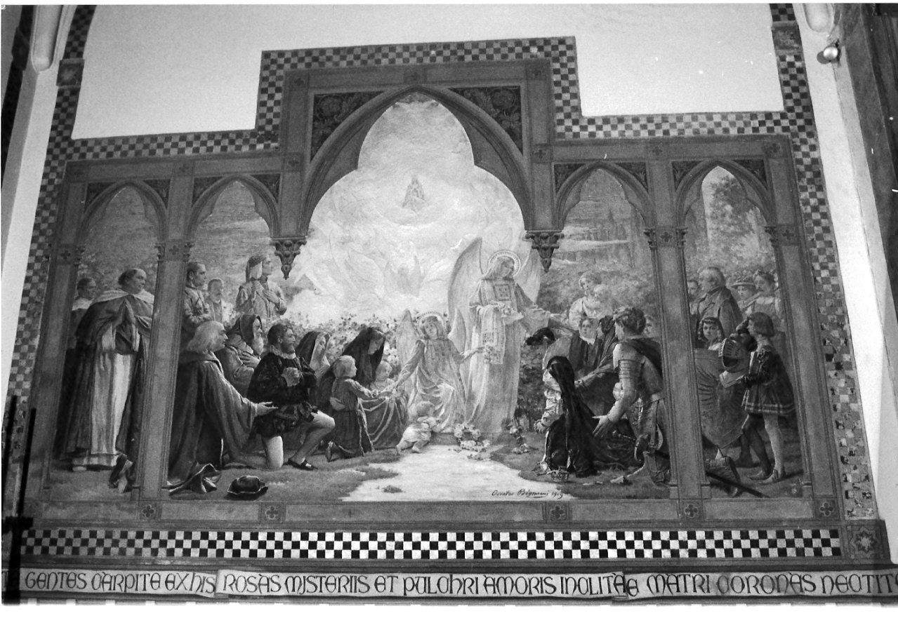 - NOTIZIE STORICO CRITICHE L'affresco, come gli altri, è opera del Bignami, a cui appartiene il complesso della decorazione della capella, già dedicata alla Madonna dei sette Dolori, di proprietà dei signori Suarez, effettuatta nel 1908 per volere del parroco Antonio Rutta. La complessità iconografica porta a mancanza di unità compositiva ed espressiva; accademico ed eclettico inoltre appare il recupero della tradizione pittorica cinque-secentesca