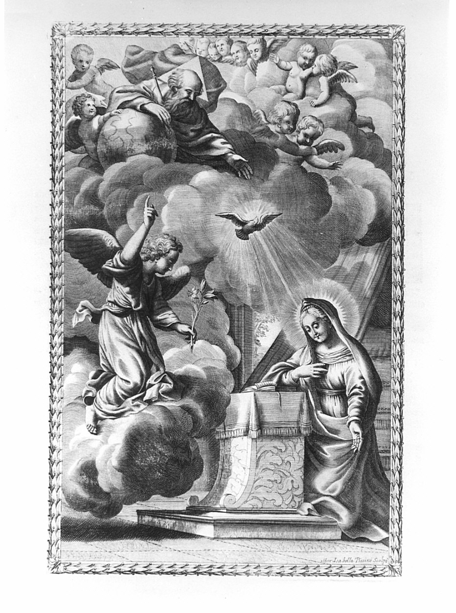 Personaggi: Madonna; angelo annunciante; Dio Padre. Figure: angeli
