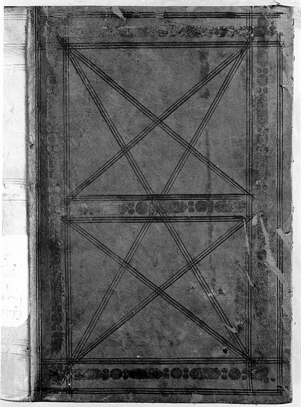 Coperta del "Libro di Tesoreria della Chiesa dal 1599 al 1655". Ciascuna faccia è decorata con una cornice di fiori impressi corrente nel mezzo di due cornicette lisce pure impresse? Al centro dello specchio corre orizzontalmente in mezzo a due cornici di righe lisce. Nei due specchi così ottenuti diagonali asimmetriche incrociate formano due stelle a cinque punte