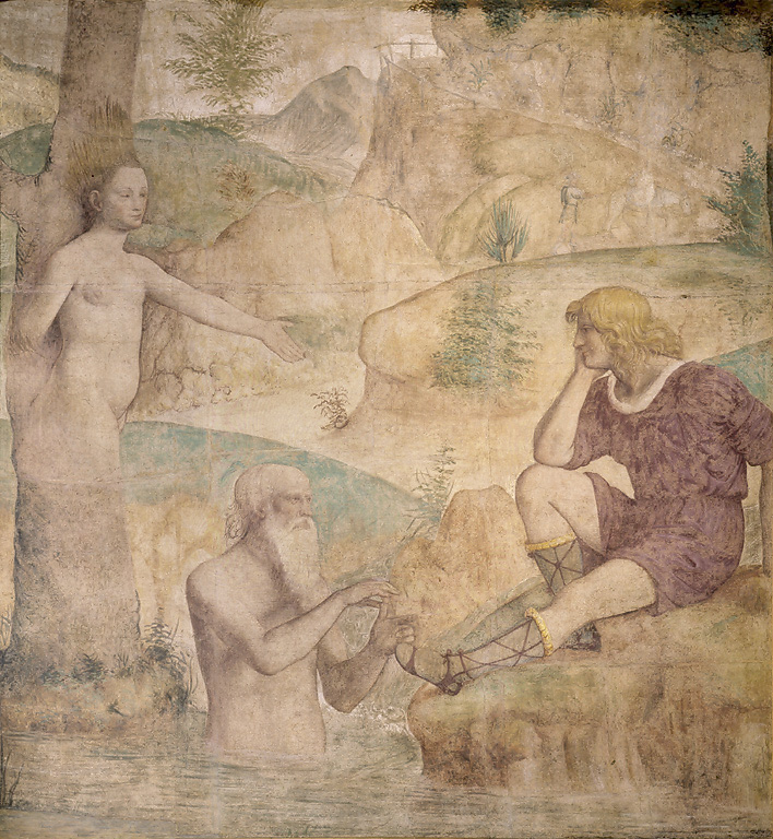 - NOTIZIE STORICO CRITICHE Tutti gli affreschi della villa furono strappati e trasportati su tavola da Stefano Barezzi fra il 1821 e il 1822, su incarico della Commissione permanente di Pittura dell'Accademia di Belle Arti di Brera, destinandoli ad arricchire le collezioni della Pinacoteca (su tale vicenda cfr. M.T. Binaghi Olivari, in Pinacoteca di Brera 1988, pp. 268-271).Gli affreschi staccati dalla stanza denominata A nella pianta disegnata dal Beltrami ed illustrante il piano terra della villa (L. Beltrami, Luini 1512 - 1532. Materiale raccolto a cura di Luca Beltrami, Milano 1911p. 203) si ispirano secondo C. Quattrini ( 2004, p. 29) soprattutto al fortunato "Ovidio Methamorphoseos vulgare" di Giovanni Bonsignori, sia nella scelta degli episodi, che nella parziale ripresa di alcuni illustrazioni. Da questa stanza provengono sicuramente la scena della "Metamorfosi di Loti con Teseo e il fiume Acheloo" (identificata anche come la "Metamorfosi di Mirra o come "Apollo e Dafne e il fiume Peneo nella valle del Temple"), il sopracamino con "Famiglia di satiri che compie un sacrificio" e due frammenti probabilmente da identificare con "Priapo e Loti" e una "Ninfa".Il sopracamino giunse a Brera il 27 giugno 1822. Per C. Quattrini (2005, p. 29) l'Ovidio Methamorpheoseos Vulgare di Giovanni Bonsignori offre la chiave per decifrare alcune scene mitologiche affrescate nella Villa: il testo, caratterizzato da una contaminazione fra I Fasti e Le Metamorfosi di Ovidio fu stampato per la prima volta nel 1497 a Venezia da Giovanni Rosso per Lucantonio Giunta e riedito almeno sei volte fino al 1523. Le xilografie, che illustrano la prima edizione sono attribuite alla stessa bottega dell'Hypnerotomachia Poliphili di Francesco Colonna (1499) e rimpiegate in diverse edizioni successive. Proprio le illustrazioni dell' Ovidio Methamorpheoseos Vulgare sarebbero servite al Luini per la realizzazione di scene di diverso significato e per la rappresentazione simultanea di più storie distribuite fra il primo piano e il fondo ed in particolare per il soggetto di questo affresco, interpretata come "Metamorfosi di Mirra" da G. Mulazzani e come "Apollo, Dafne e il fiume Peneo nella Valle del Tempe" da M.T. Binaghi Olivari. Il testo di Buonsignori, infatti, rimaneggia e contamina passi delle Metamorfosi IX, 330 - 390) e dei Fasti (I, 415 - 440): fra le trasformazioni di donne in alberi narrate da Ovidio, oltre alla favola di Dafne e di Mirra, trovano una certa rispondenza con l'affresco di Luini quelle di Loti e di Driope, nel loro adattamento proposto dal Buonsignori. In particolare il volgarizzamento del Buonsignori, pur rifacendosi alla schema delle Metamorfosi, presenta rispetto ai testi di Ovidio diverse varianti: Loti, che nei Fasti è aggredita da Priapo durante il sonno, ma viene svegliata a tempo dal raglio diel'asino di Sileno, viene destata, nel testo cinquecentesco, dal raglio del sacerdote Argesto (personaggio no presente nel testo ovidiano) e trasformata in pianta: Driope, commossa dalla vicenda della ninfa, si era rifiutata di avere rapporti sessuali con il marito e finì per subire la stessa sorte. Per C. Quattrini, dunque, in una sorta di compendio dipinto dei personaggi ovidiani, sarebbero presenti: il fiume Acheloo, che nelle Metamorfosi ovidiane narra a Teseo, suo ospite al ritorno dalla caccia al cinghiale caledonio, diversi esempi di trasformazioni da identificare con il vecchio barbuto immerso nelle acque del fiume e che enumera sulle dita gli eventi narrati; Teseo, seduto sulla riva del fiume, raffiguratoin atto di ascoltare; la donna albero rappresenterebbe infine Loti, e sullo sfondo la figura abrasa in costume bucolico che conduce un asinello, potrebbe rappresentare il sacerdote Argesto: alcuni particolari della scena potrebbero essere derivati dalla xilografia illustrante il testo del Buonsignori, in cui il sacerdote Argesto, intento a legare l'asino ad un albero, è vestito anch'esso di una semplice tunica
