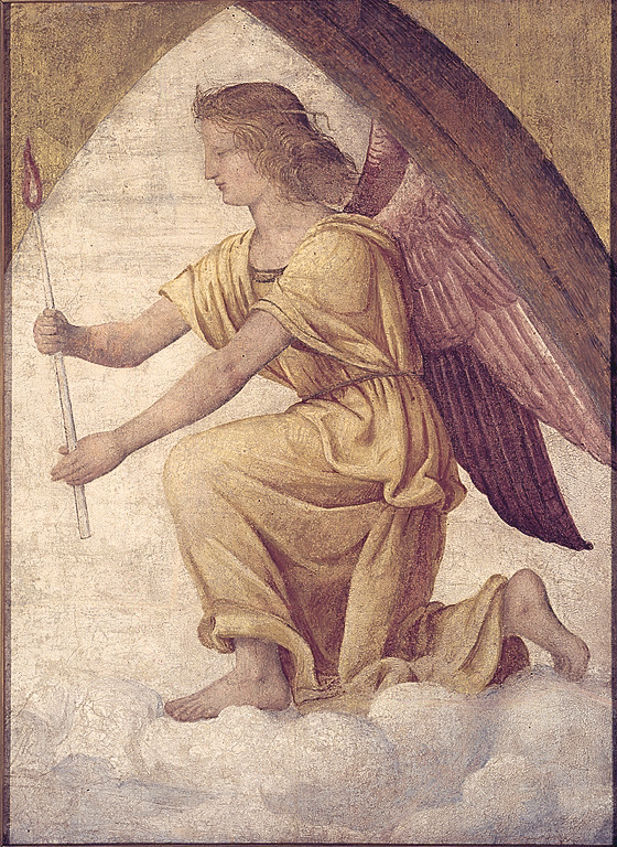 - NOTIZIE STORICO CRITICHE Tutti gli affreschi della villa furono strappati e trasportati su tavola da Stefano Barezzi fra il 1821 e il 1822, su incarico della Commissione permanente di Pittura dell'Accademia di Belle Arti di Brera, destinandoli ad arricchire le collezioni della Pinacoteca (su tale vicenda cfr. M.T. Binaghi Olivari, in Pinacoteca di Brera 1988, pp. 268-271). Si trovava originariamente a destra della porta d'accesso della cappella della villa.Del corrispondente angelo di sinistra si conoscono due esemplari: il primo, già di proprietà Guzzi a Milano, poi Platt Englewood e il secondo nella collezione Cicogna a Milano