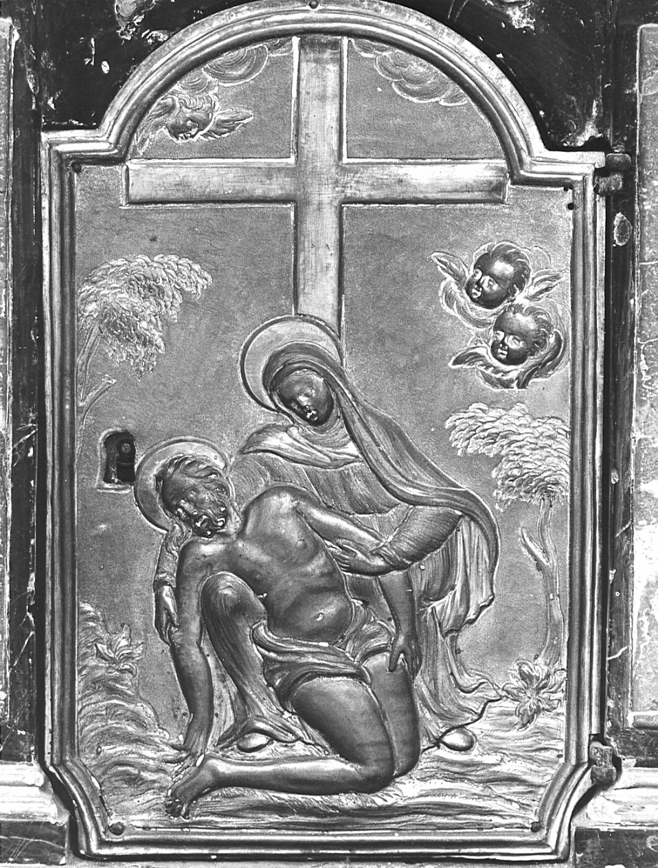 La porticina, coeva all'altare cui appartiene (inizi sec. XVIII) è in lamina di ottone sbalzato, cesellato e dorato, rappresenta Cristo deposto, in posizione inginocchiata, volto all'indietro, mollemente adagiato sulle ginocchia della madre avvolta in un manto dall'ampio panneggio piatto. Al centro della composizione la croce, dietro alla quale si vede un accenno di paesaggio finemente tratteggiato. In alto a destra due teste di angeli