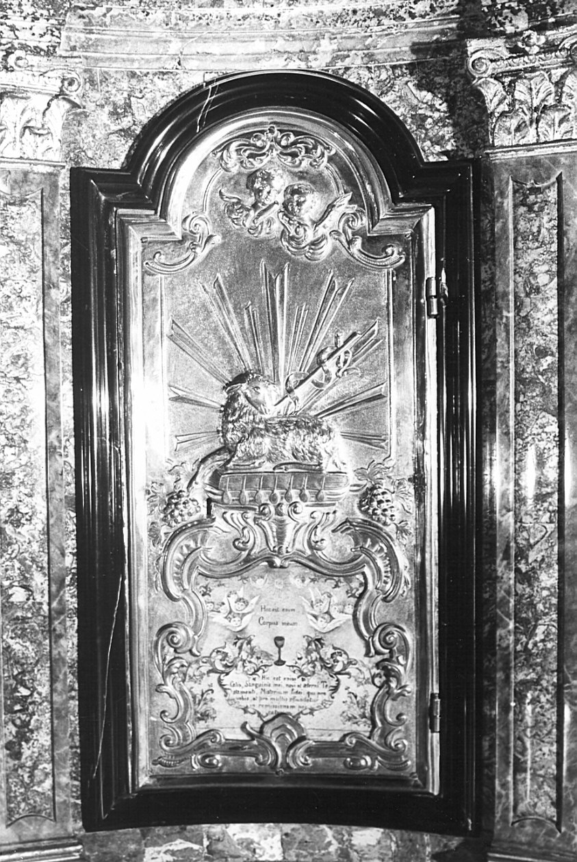 Sportello a contorno mistilineo in metallo. Cornice in marmo nero. Al centro agnello sormontato da teste d'angelo e fiancheggiato da grappoli d'uva. La parte inferiore costituisce a sua volta cornice per un dipinto su pergamena raffigurante l'Ostia e il calice circondati da schiere d'angeli e recante la scritta sotto menzionata