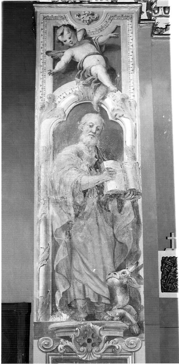 Personaggi: San Luca. Attributi: (San Luca) toro alato; libro. Figure: angelo