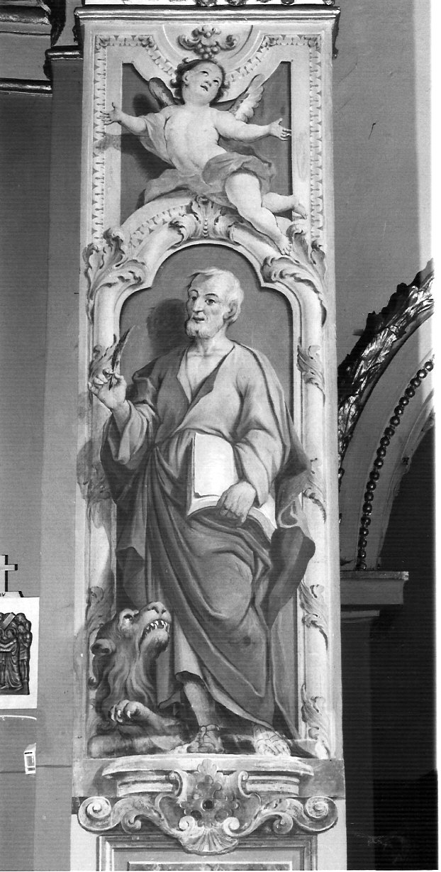 Personaggi: San Marco. Attributi: (San Marco) leone; libro. Figure: angelo. Oggetti: penna