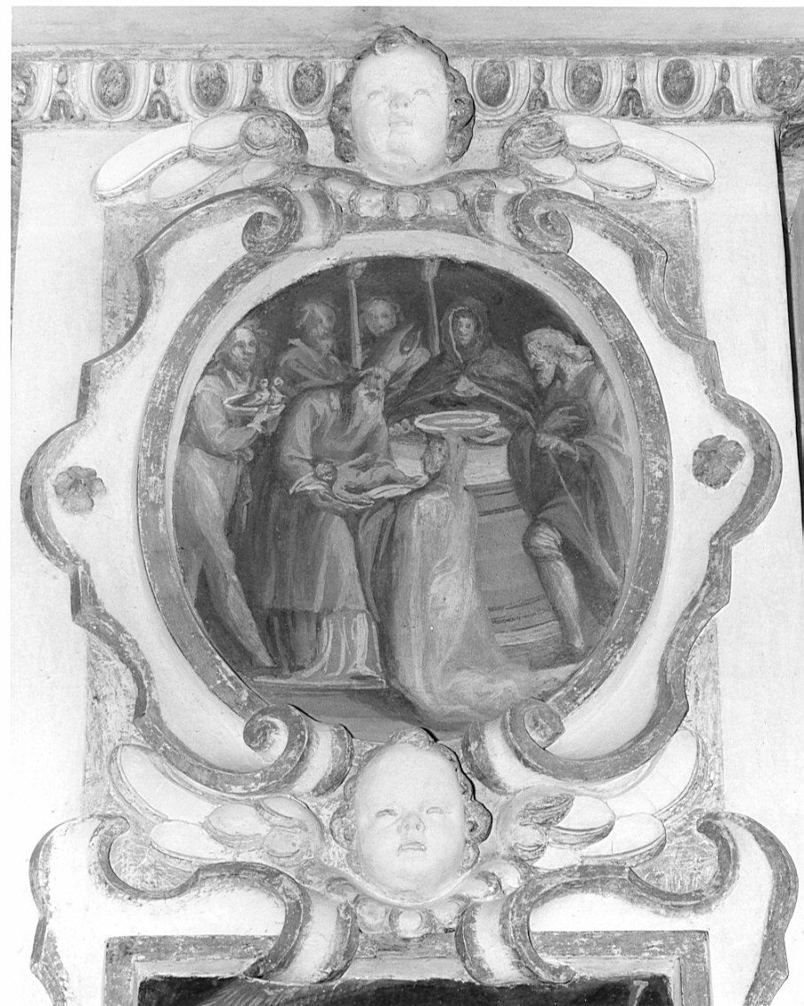 Riquadro entro cornice in stucco a cartiglio con cherubini