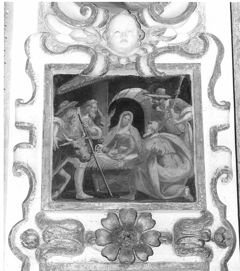 Dipinto entro cornice in stucco con cherubino e rosetta apicale
