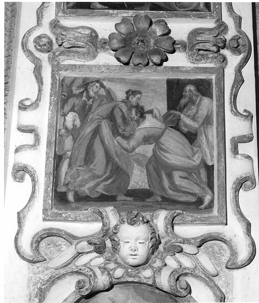 Riquadro entro cornice in stucco con rosetta e cherubino apicali