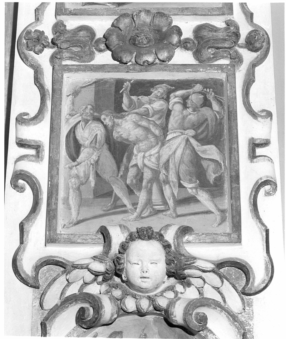 Riquadro entro cornice in stucco con rosetta e cherubino apicali