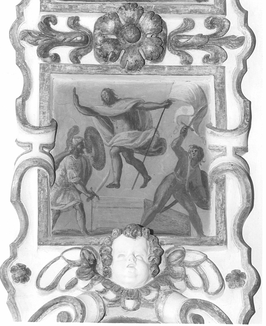 Riquadro entro cornice in stucco a cartiglio con cherubino apicale e rosetta